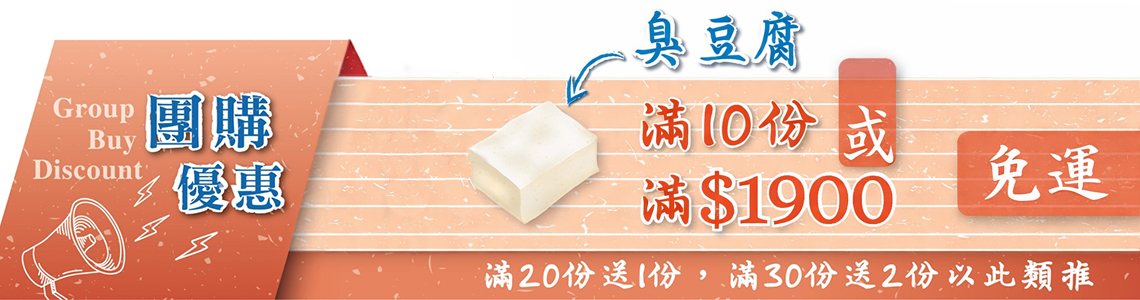 消費滿1900,享免運優惠。臭豆腐(190/份)購買滿20份送一份,滿30份送兩份,以此類推。